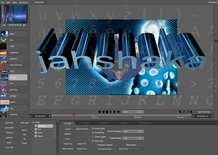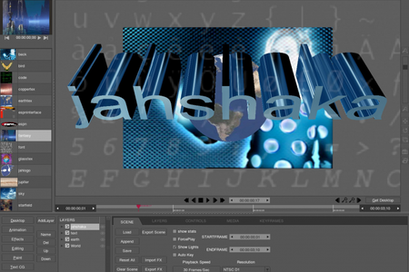 В Jahshaka есть 3 независимо настраиваемых модуля. Первый модуль предназначен непосредственно для редактирования видео материалов. Второй - для редактирования визуальных эффектов. И, наконец, третий служит для работы с 3х мерными объектами, которые могут быть анимированы и вставлены в видео. Интерфейс каждого модуля можно настроить под себя. Кроме этого, в Jahshaka есть возможность параллельной работы нескольких пользователей над одним проектом.