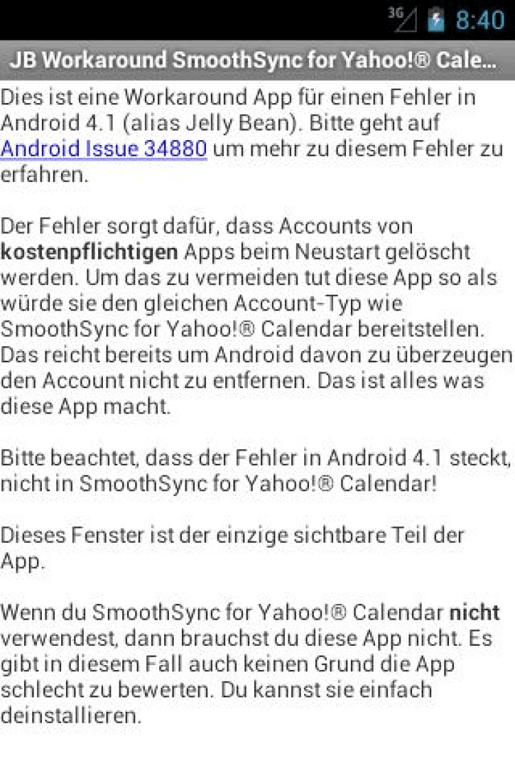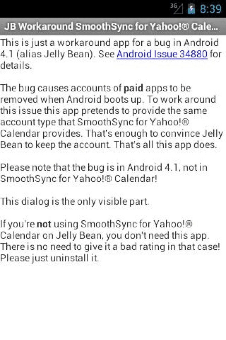 JB Workaround for Yahoo! Cal Программа, исправляющая баг в Android версии 4.1, из за которого у пользователей платной версии SmoothSync для Yahoo! Calendar удалялись все настройки при перезагрузке устройства. Вам потребуется данная программа только если вы используете Cloud Calendar на Android 4.1.