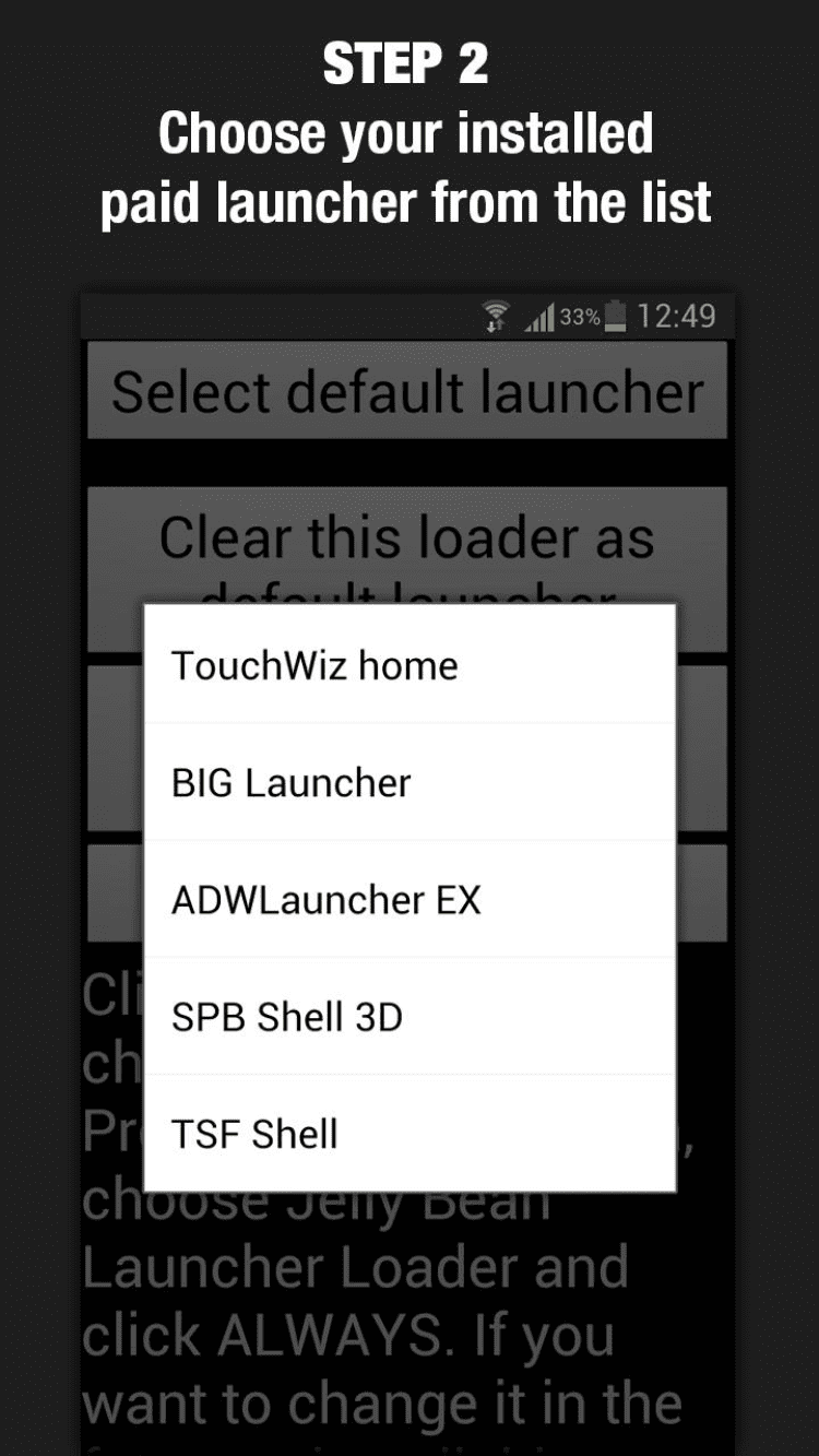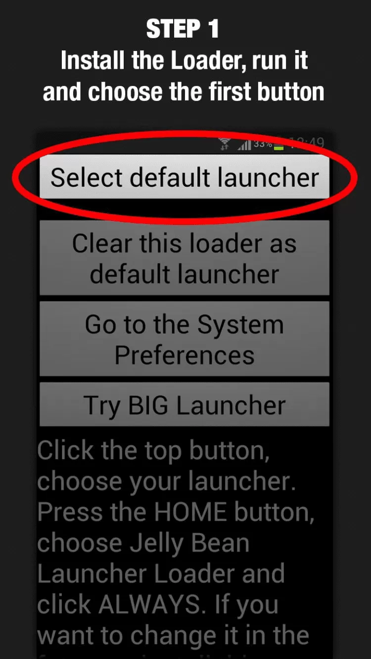 Jelly Bean Launcher Loader Дополнение для платной версии приложения BIG Launcher, которое исправляет баг на устройствах Android 4.1, 4.1.1 и 4.1.2, из-за которого полная версия лаунчера не загружается по умолчанию при перезагрузке устройства. Чтобы исправить этот баг, запустите данное приложение и установите BIG Launcher лаунчером по умолчанию на вашем устройстве.