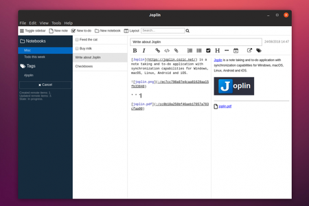 Joplin - это бесплатное приложение для ведения заметок и дел с открытым исходным кодом, которое может хранить большое количество заметок, организованных в блокноты.