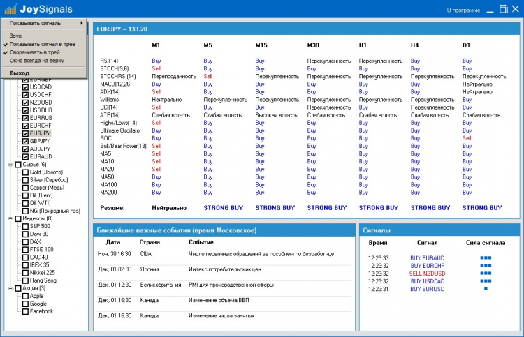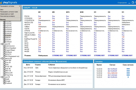 JoySignals - это программа, помогающая торговать на валютном рынке и рынке бинарных опционов. На основе анализа индикаторов предоставляет рекомендации по торговле.