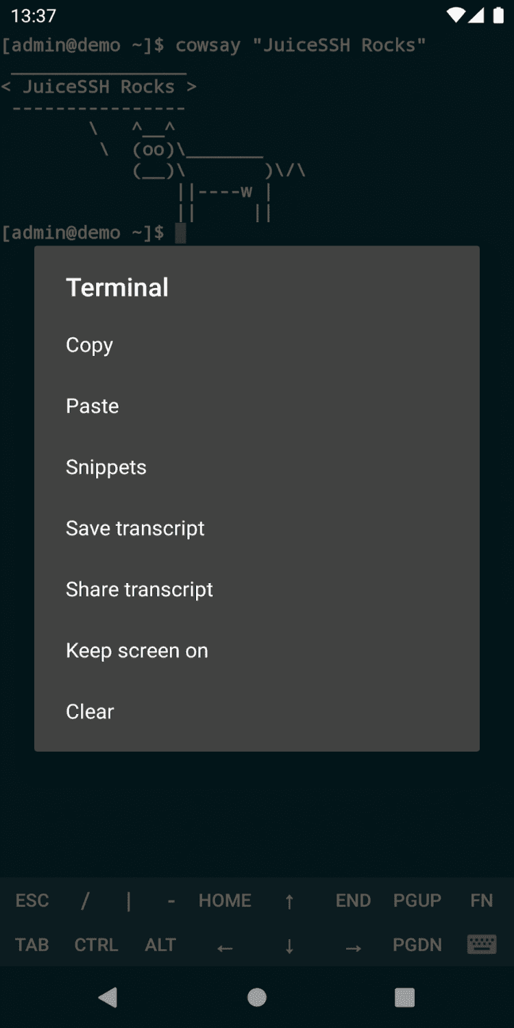 JuiceSSH - SSH Client — это удобный терминал для Android с поддержкой SSH, локального Shell, Mosh и Telnet. Программа поддерживает защиту доступа паролем, ввод символов UTF-8, обладает удобной всплывающей клавиатурой со всеми необходимыми символами и позволяет менять размер шрифта нажатием на кнопки изменения громкости.