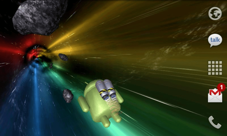 Jumpgate Free Live Wallpaper Красивые живые обои на космическую тематику с изображением логотипа Android, перемещающийся в гиперпространстве, уворачиваясь от астероидов. Поддерживается любое разрешение экрана.