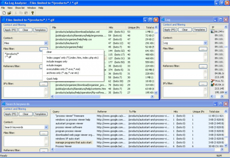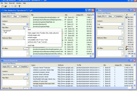 Ka Log Analyzer - это небольшая утилита для анализа лог-файлов веб-сайтов. Предоставляет динамические результаты на основе фильтров.