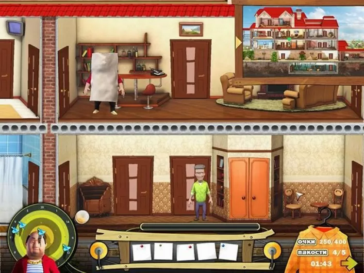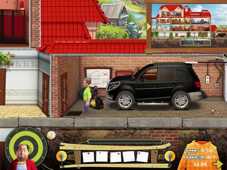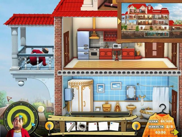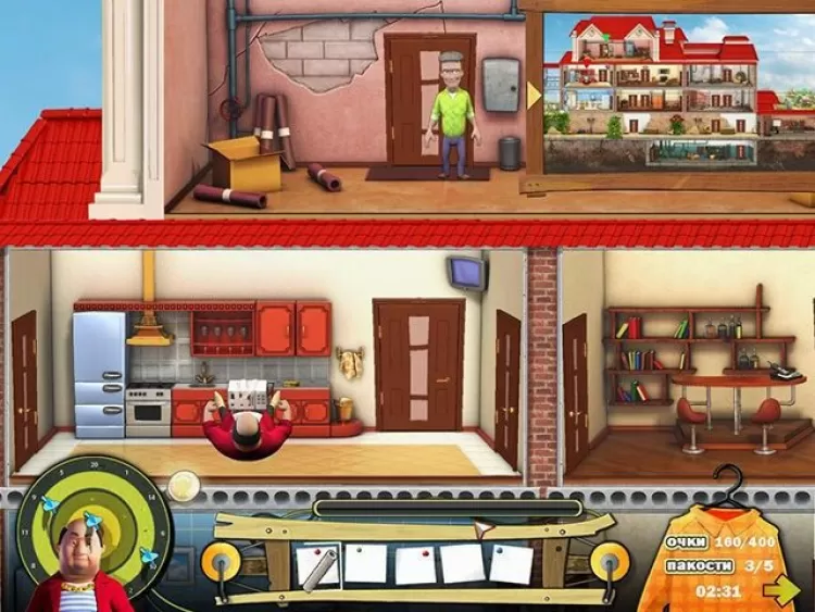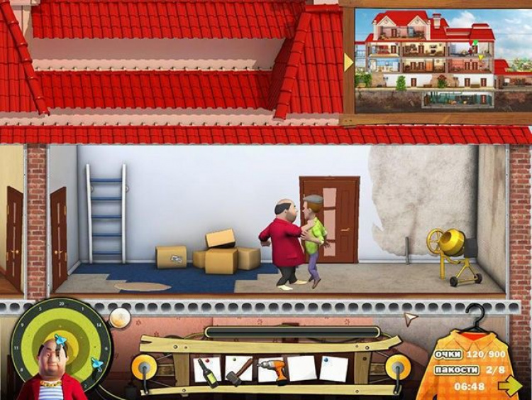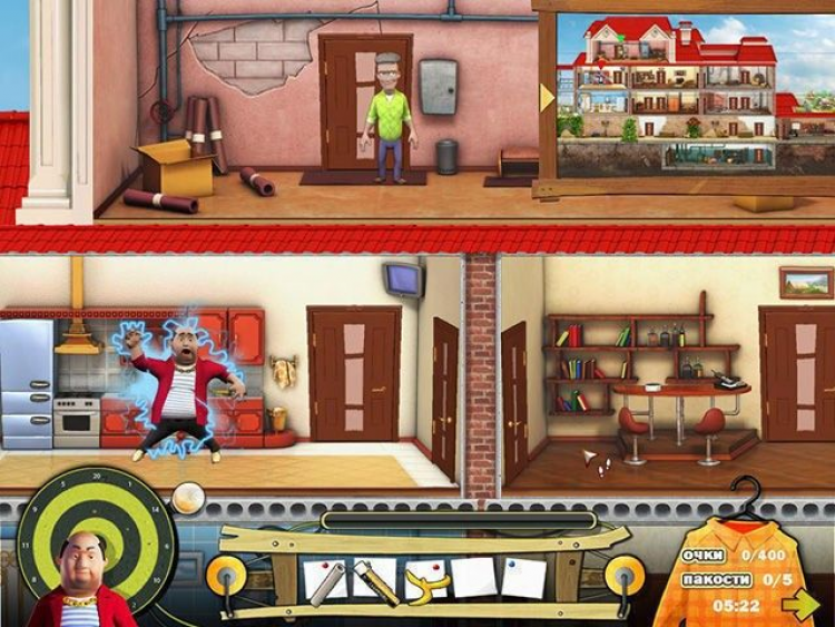 Сейчас там идет ремонт, и это вам только на руку значит, в доме много инструментов и строительных материалов. Если проявить немного смекалки... жизнь незваного олигарха может стать гораздо веселее! И пусть наглец задумается, ту ли деревню он выбрал для своего загородного дома. Перед вами весь дом олигарха, как на ладони. Шикарно он тут устроился: большой подвал, несколько спален, гостиная, столовая, просторный чердак и ванная комната. Есть где пошалить с размахом! Собирайте полезные предметы в инвентарь: ведро с водой, моментальный клей, дрель, молоток все это вам обязательно пригодится. Ходите по комнатам и смотрите, где и как можно напакостить.