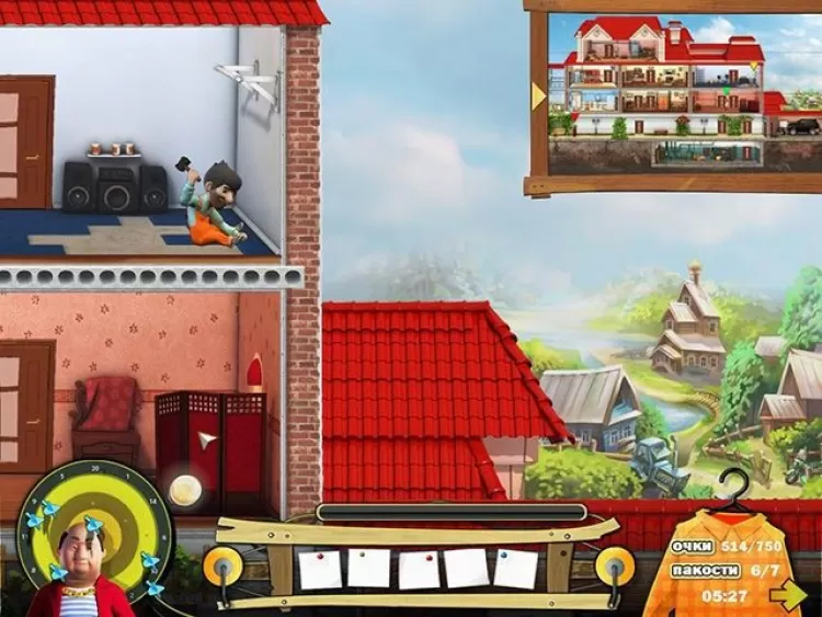Вот в углу стоят коробки с надписью Осторожно, стекло! ударьте по ним молотком, да посильнее! А тут лежит замечательный половичок приклейте его к полу, толстяк наверняка об него запнется. Заодно пролейте воду в коридоре, чтобы проверить, как у вашего соседа с пластикой и координацией движений. Станьте виртуозом пакостей и выдворите нежеланного гостя из любимой деревни. Действуйте быстро и старайтесь не попасть олигарху на глаза, иначе вы получите пару увесистых тумаков и на этом уровень завершится. Смекалка и проворство помогут вам стать неуловимым мстителем, настоящим Робин Гудом из деревни Неждалово!