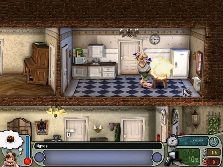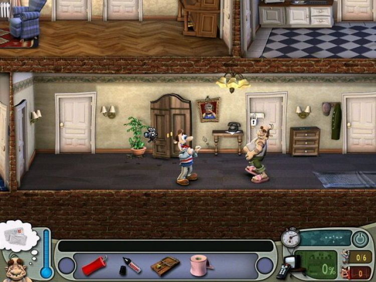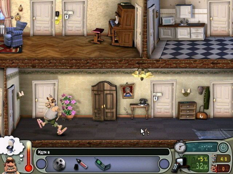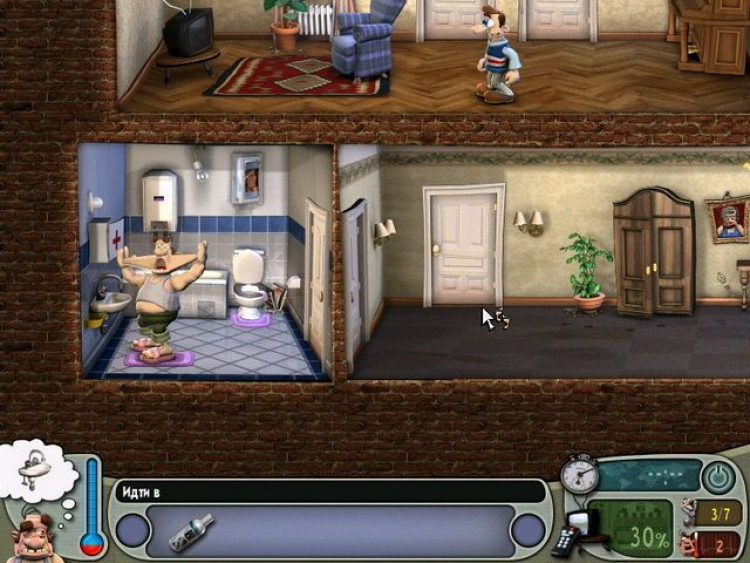 Мыло, туалетная бумага, крем для бритья устройте хаос в этом местечке! А вот расслабляться не стоит внимательно следите за каждым шагом соседа, чтобы вовремя скрыться. Если же вы все-таки упустили его из виду или просто увлеклись своими проделками быстро полезайте в шкаф или под кровать. Но можно, конечно, и смекалку подключить например, отвлечь противника телефонным звонком. Разгневайте соседа, и зрительская симпатия вам обеспечена!
