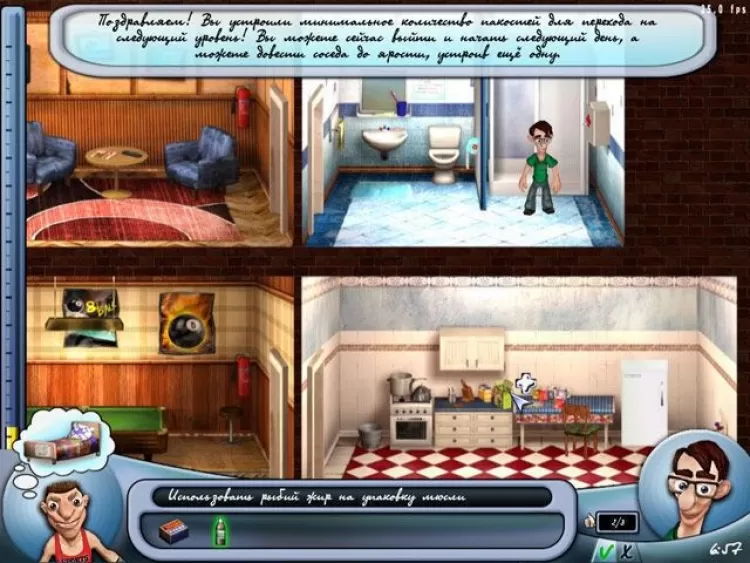 Сосед постоянно находится дома, спит, ест и играет в компьютерные игры. Отличное время, чтобы учинить какую-нибудь пакость и вывести его из себя. Устраивать западни и ловушки можно самыми разными методами. Общежитский быт как ничто другое располагает к придумыванию всевозможных шуток и шалостей. Если навести курсор на какой-нибудь предмет, вы увидите значок, который подскажет вам, что с этим предметом можно сделать. Помните, что ни один предмет в этой игре не появляется на уровне просто так. Если вы нашли нож, то где-то поблизости есть веревка или шнур, если обнаружили коробку с канцелярскими кнопками поищите, куда их можно воткнуть или подсыпать! Будьте внимательны и старайтесь обнаружить все способы досадить соседу!