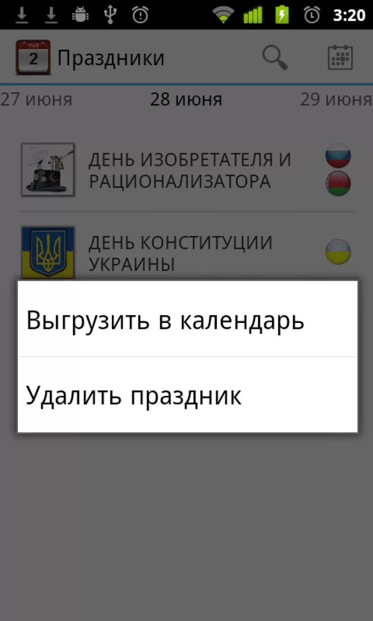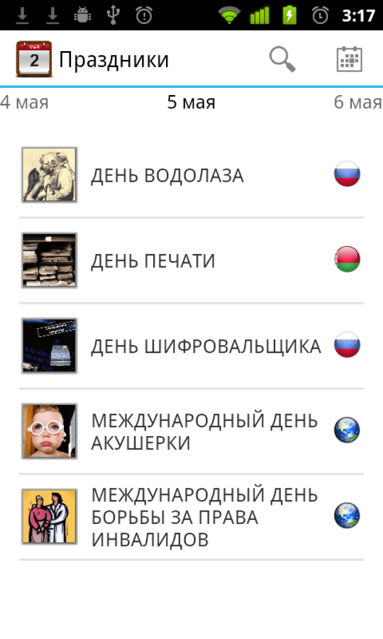 Календарь праздников расскажет Вам о том, какие праздники отмечаются в тот или иной день любого года. Календарь содержит описание национальных праздников России, Украины и Белоруссии, а также большого количества международных праздников и памятных дат. Даты скользящих праздников пересчитываются автоматически для каждого года. Вы можете с легкостью найти интересующий Вас праздник или узнать, с чем можно поздравить друзей завтра, послезавтра, а, может, и через пару лет. Для работы программы не требуется подключение к Интернету.