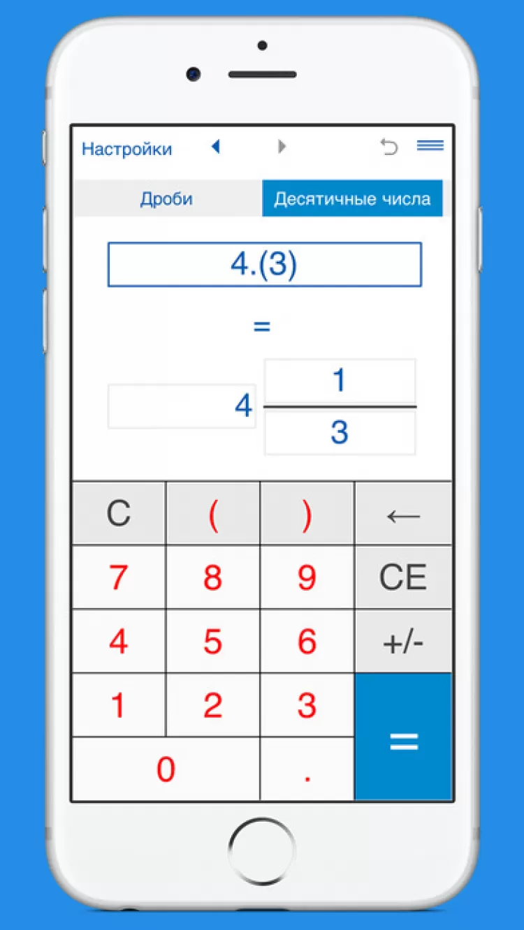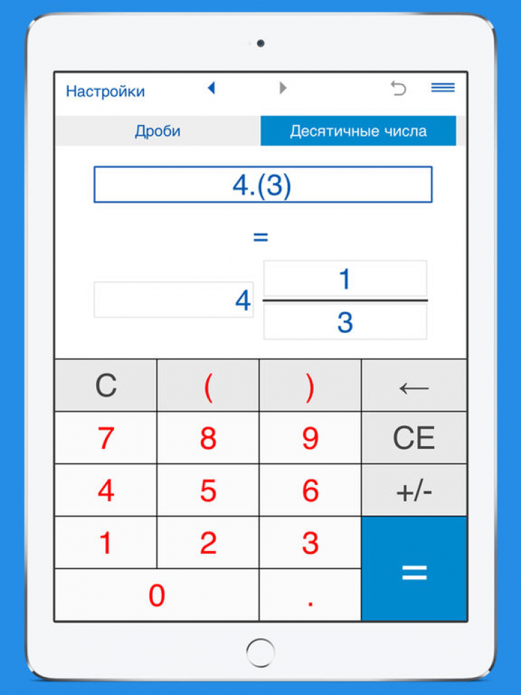Калькулятор для перевода дробей Данный калькулятор поможет вам быстро и легко перевести обыкновенные дроби и смешанные числа в десятичные дроби и наоборот. Калькулятор переводит как конечные, так и бесконечные периодические десятичные дроби. Для перевода обыкновенной дроби в десятичную: выберите опцию "обыкновенные дроби в десятичные", введите дробь и нажмите знак "=". Чтобы перевести десятичную дробь в обыкновенную, выберите опцию "десятичные дроби в обыкновенные", введите десятичное число и нажмите знак "=". При вводе периодических дробей, период (повторяющиеся цифры) надо заключить в скобки. Например, число 0.24333... должно быть записано 0.24(3), число 5.123123... как 5.(123).