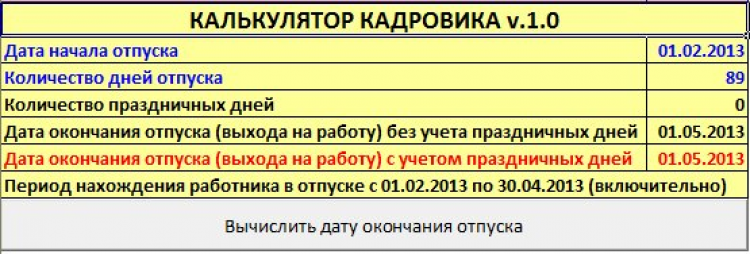 Калькулятор кадровика - это программа, которая поможет табельщикам и кадровикам любых организаций составить графики отпусков сотрудников. Нет необходимости каждый раз вручную вести подсчет дней в календаре, учитывать государственные праздники, а в случае ошибки начинать все заново! Достаточно один единственный раз указать все памятные даты в программе и смело начинать с ней работать. Все действия пользователя сводятся буквально в три шага. Ввести дату выхода сотрудника в отпуск, затем количество дней отпуска и нажать на кнопку расчета.