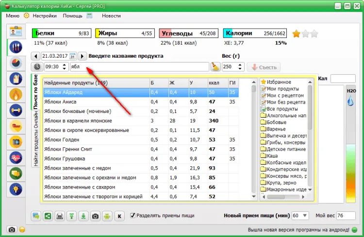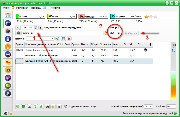 Программа будет полезна для желающих управлять своим весом. Особенно для тех, кто хочет качественно похудеть или набрать вес. Она поможет Вам правильно рассчитать дневную норму калорий, норму веса, индекс массы тела, а также даст множество полезных рекомендаций. Отмечайте съеденную пищу в специальном ежедневнике, используйте имеющуюся базу продуктов и добавляйте свои блюда и продукты. Будьте всегда в курсе, какое количество калорий вы уже употребили за день. Не позволяйте себе превышать установленный лимит по калориям, чтобы достичь намеченных результатов. Не выходите за рекомендуемый лимит и результат не заставит себя ждать!