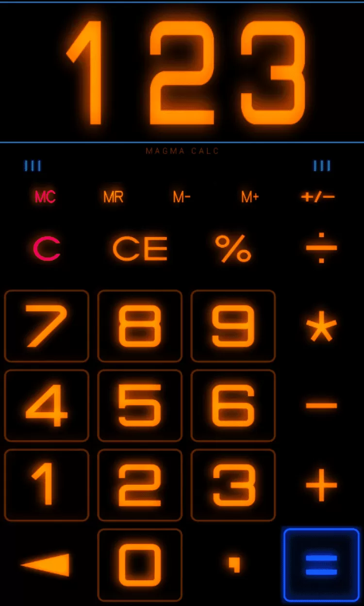 Калькулятор MAGMA Красивый и удобный математический калькулятор. Он имеет функцию запоминания, позволяет работать с процентами, а так же имеет подсветку кнопок с цифрами для облегчения печати в темноте.