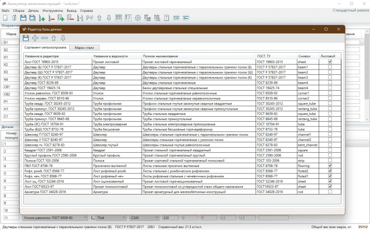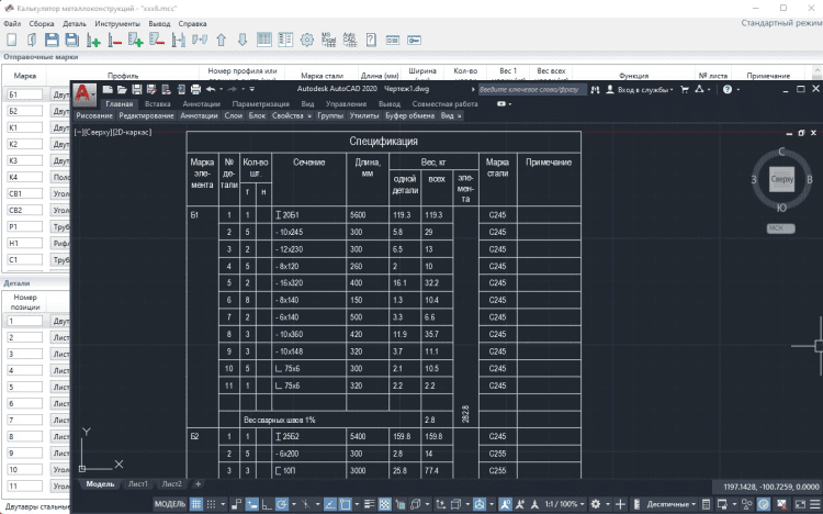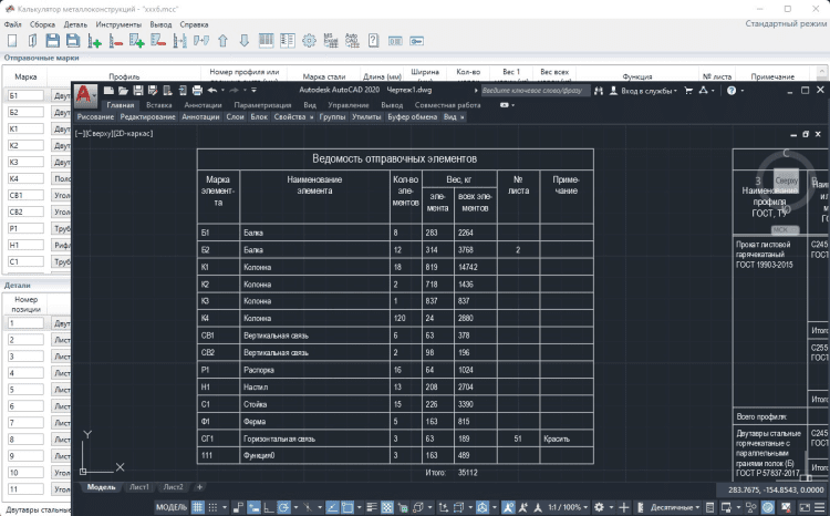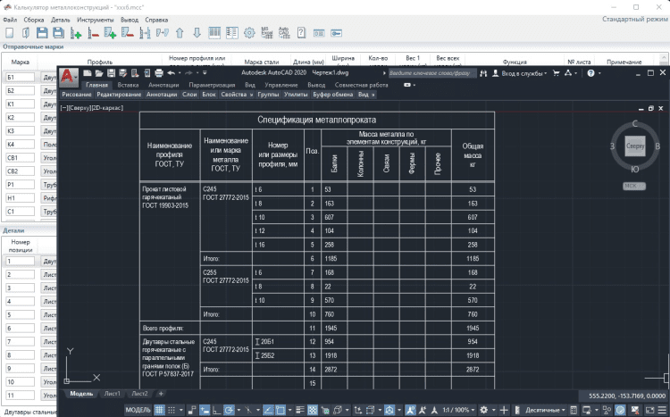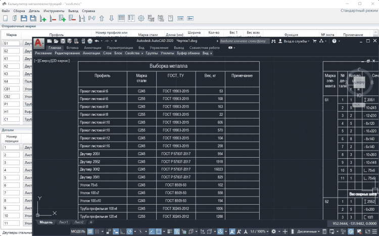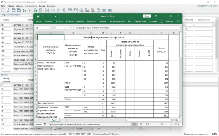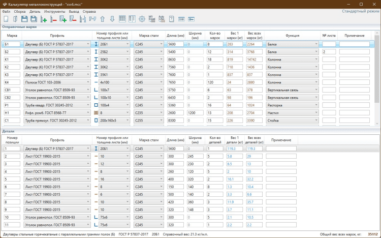 Программа "Калькулятор металлоконструкций" предназначена для подсчета количества металлопроката и создания ведомостей и спецификаций для проектной и рабочей документации металлических конструкций строительных объектов. Создавайте отправочные марки и детали, а затем выводите спецификации в формате Excel или AutoCAD. Есть возможность добавлять свои профили, марки стали, настраивать точность масс, учитывать наплавленный металл и многое другое.