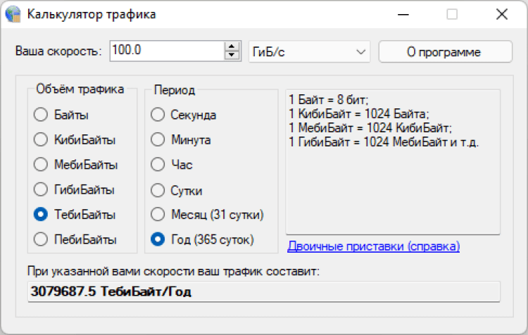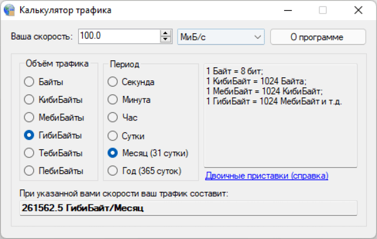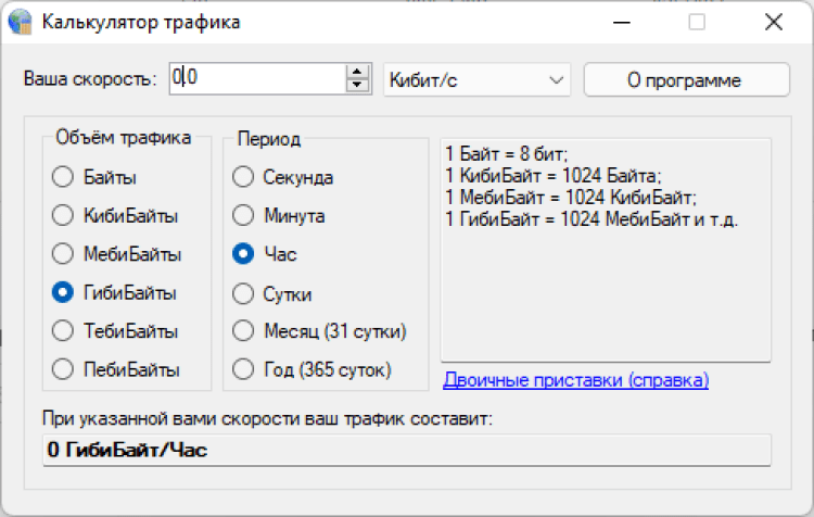 Калькулятор трафика - это портативная программа, предназначенная для подсчета трафика при заданной скорости соединения за определенный промежуток времени в различных величинах. Поможет составить тариф или распланировать потребление тарфика в условиях ограничений.