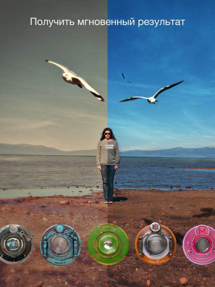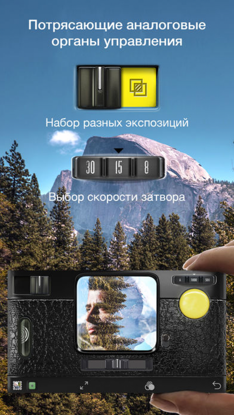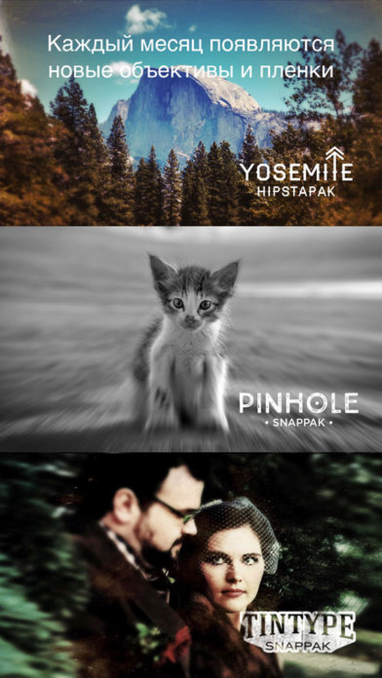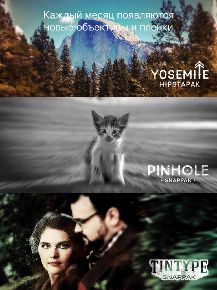 Камера Hipstamatic Цифровое фото совсем не похоже на аналоговое. Данная программа переносит вас в мир фото на пленочных "камерах-мыльницах" из прошлого. Тот же вид, стиль, особая непредсказуемая красота и радость, которую вы испытаете от этих снимков. Это приложение сохраняет индивидуальность и свежесть фото, снятых на старых камерах, но добавляет новые возможности - смену объектива, пленки, режима вспышки - и все это простым нажатием кнопки.