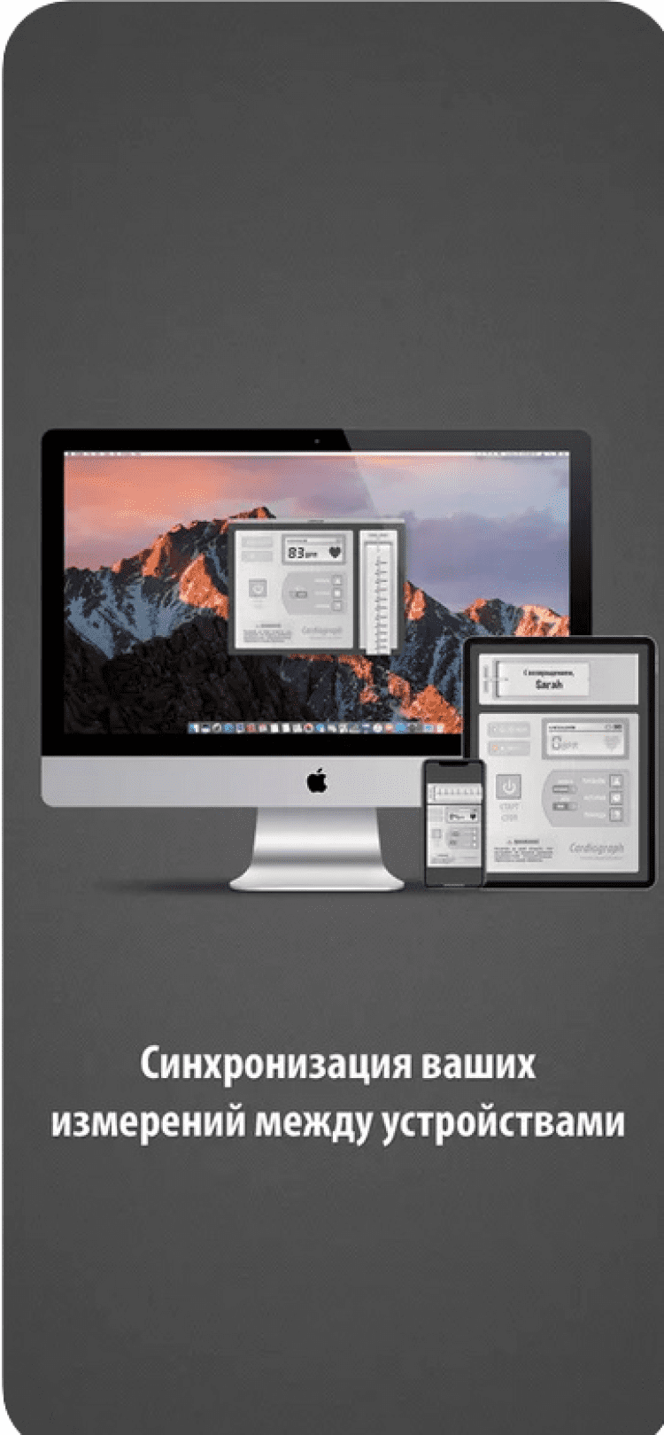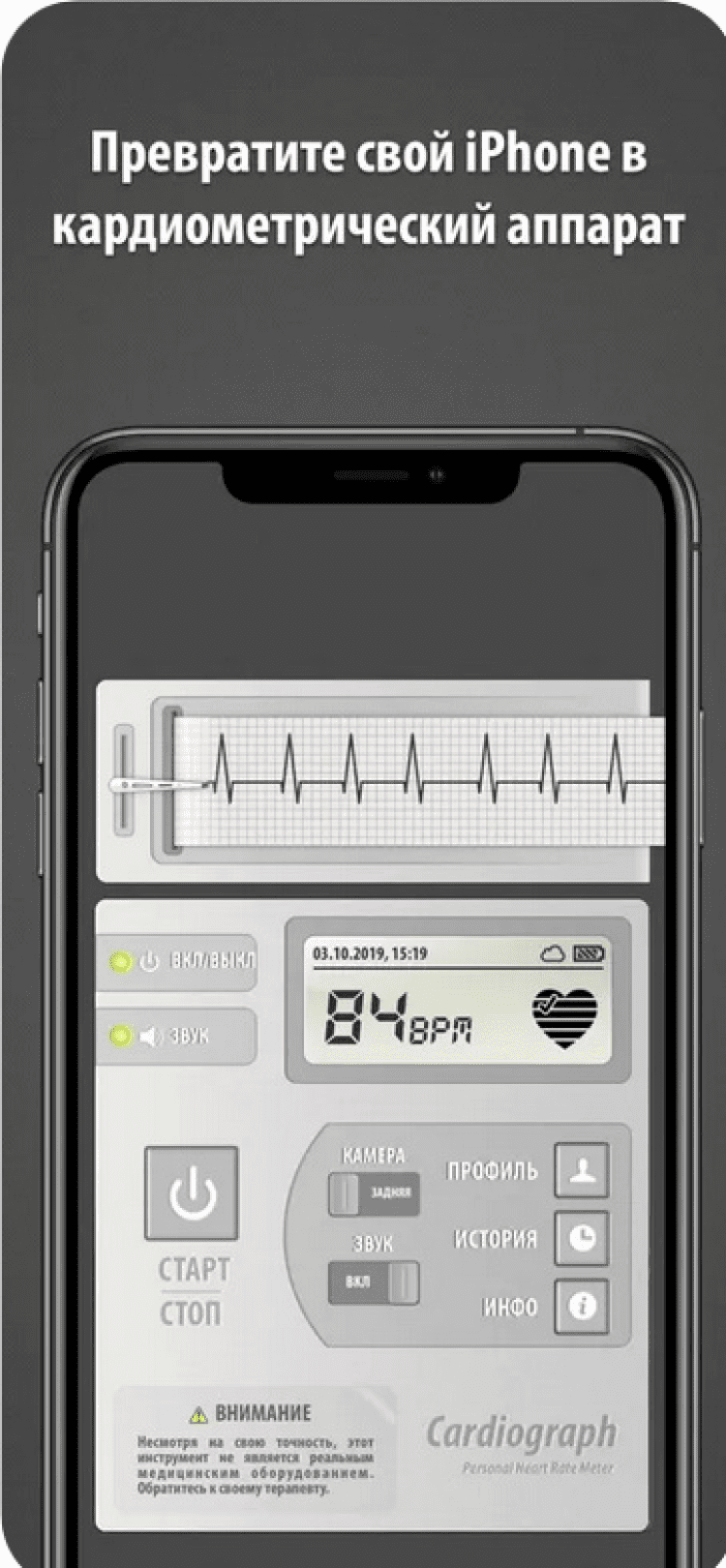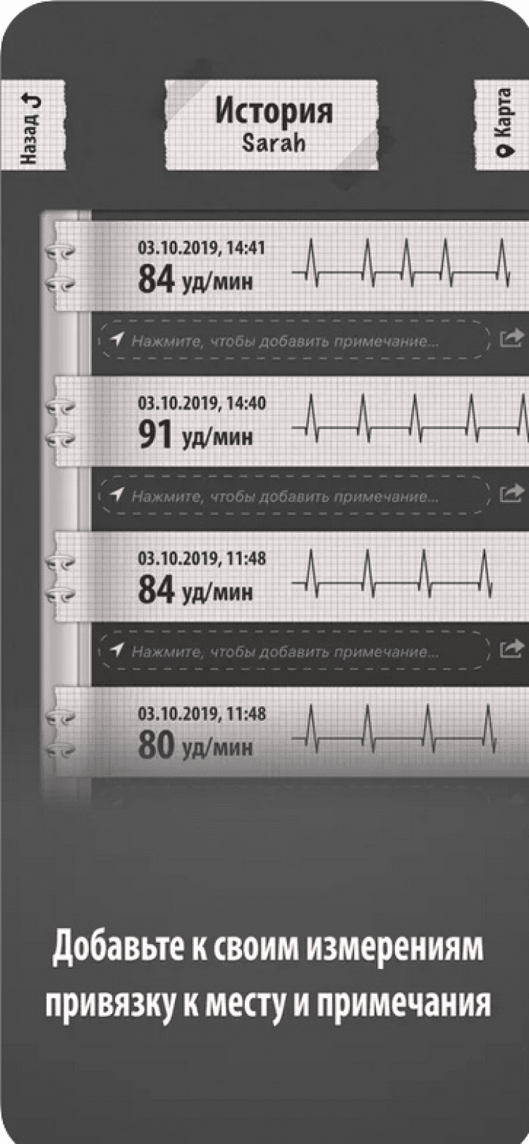 Кардиограф С помощью этой программы вы сможете измерить свой сердечный ритм и сохранять результаты для долгосрочного наблюдения. Так же, эта программа позволит создавать персональные профили для сохранения результатов исследования разных людей, к которым можно добавлять примечания. Результаты можно отправлять на печать, чтобы продемонстрировать вашему лечащему врачу. Все данные в приложении будут автоматически синхронизироваться с остальными вашими устройствами при помощи iCloud. Обратите внимание, что измерения должны производиться в условиях хорошего освещения.