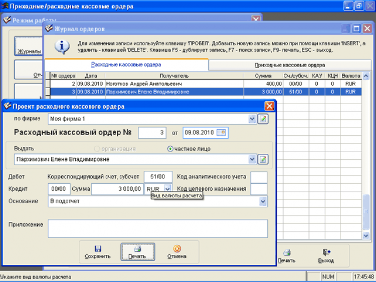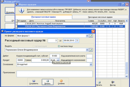 Кассовые ордера - это программа для работы с приходными и расходными кассовыми ордерами (формы КО-1, КО-2). Работает с рублями и валютой.