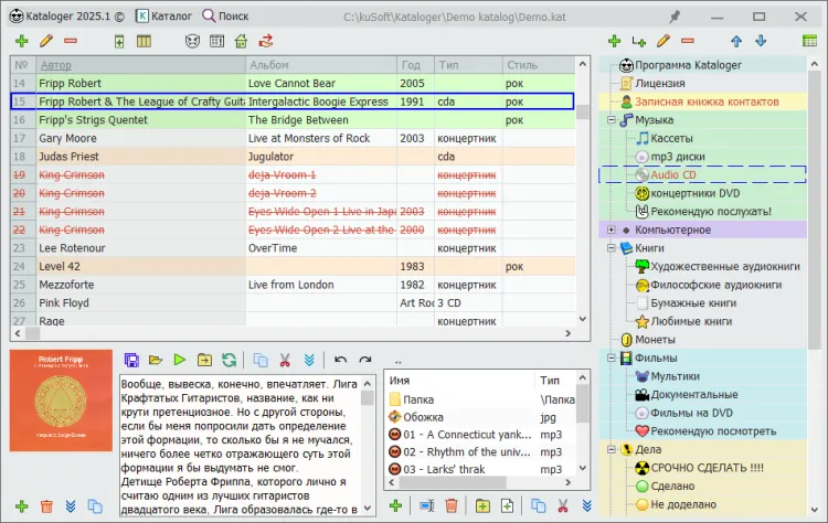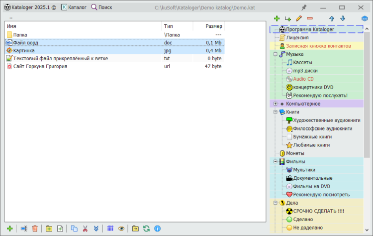 Kataloger - это программа, с помощью которой вы можете создать свою удобную базу данных, заметок, планов, списков, файлов, таблиц, смет и всего прочего, чего душе угодно.
