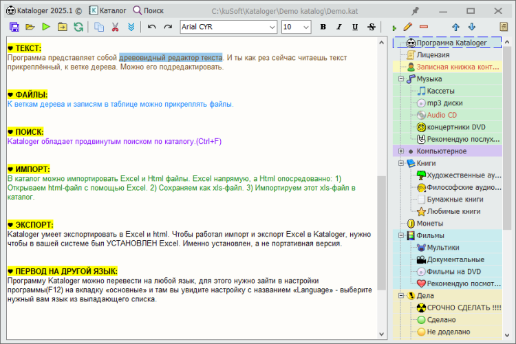 · Kataloger – это программа НЕ только для работы с таблицами, но и для ведения текстовых заметок, и для прикрепления/организации файлов. Плюс возможность организации всех этих данных в дерево!