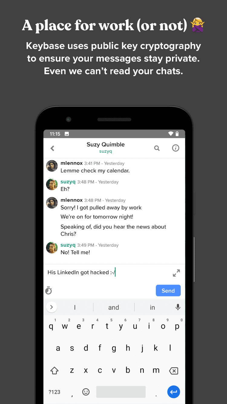 Keybase - мобильное приложение для Android, с помощью которого вы сможете безопасно обмениваться сообщениями и файлами с другими пользователями.