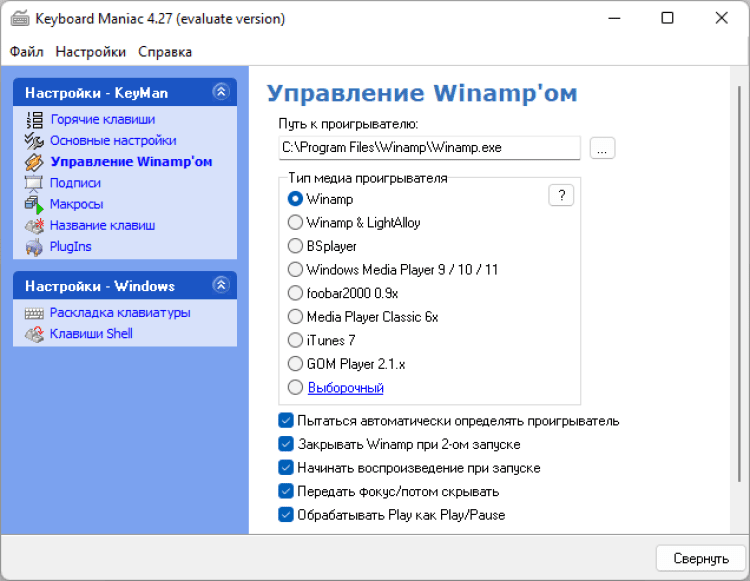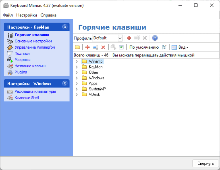 Keyboard Maniac - это менеджер горячих клавиш, который позволяет работать с нестандартными клавишами на мультимедийных расширенных клавиатурах, без установки дополнительных драйверов. Программа проста в управлении, но содержит множество дополнительных настроек, то есть подходит как новичкам, так и профессионалам настоящим клавиатурным маньякам. Особое внимание уделено управлению мультимедийным проигрывателем Nullsoft Winamp (поддерживаются версии 2х,5х, версии 3х не поддерживаются).