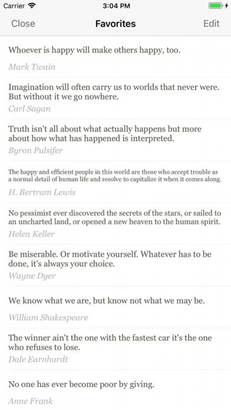 Харизматик В приложении, наполненном мыслями мудрецов и философов, афоризмами писателей и выдающихся людей, нет ни каталога фраз, ни списка авторов. Мы не верим в случайный выбор. Вы сами руководите своей судьбой. Просто прислушайтесь к себе. Задумайтесь, и одно из самых вдохновляющих высказываний человечества послужит знаком именно для Вас.