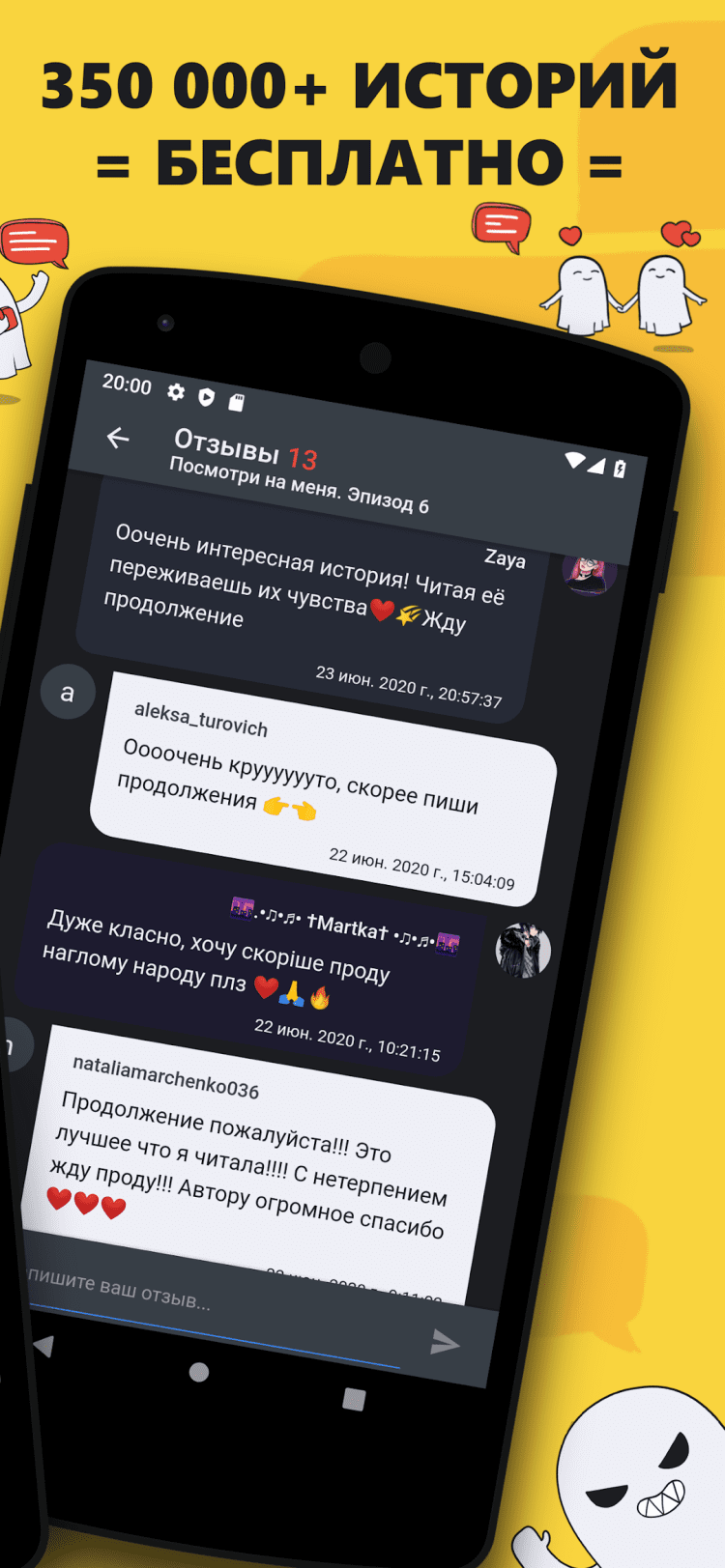 В этом приложении вас ждет огромное количество крутых историй в форме переписки, которые вы сможете читать даже без подключения к Интернету. Любите читать короткие рассказики? Тогда милости просим. Все истории доступны бесплатно, вы можете читать их, добавлять в копилку. Формат переписки этих историй добавляет ощущения реализма, словно вы читаете переписку двух людей.