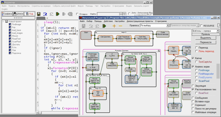 Создание сценариев возможно как с помощью Си образного языка, имеющего в своем арсенале более 100 не имеющих аналогов разработанных функций анализа экрана, распознавания текста, управлением мыши и клавиатуры, управление процессами и многое другое. Так и с помощью Визуального редактора кода в виде графических наглядных блок схем.