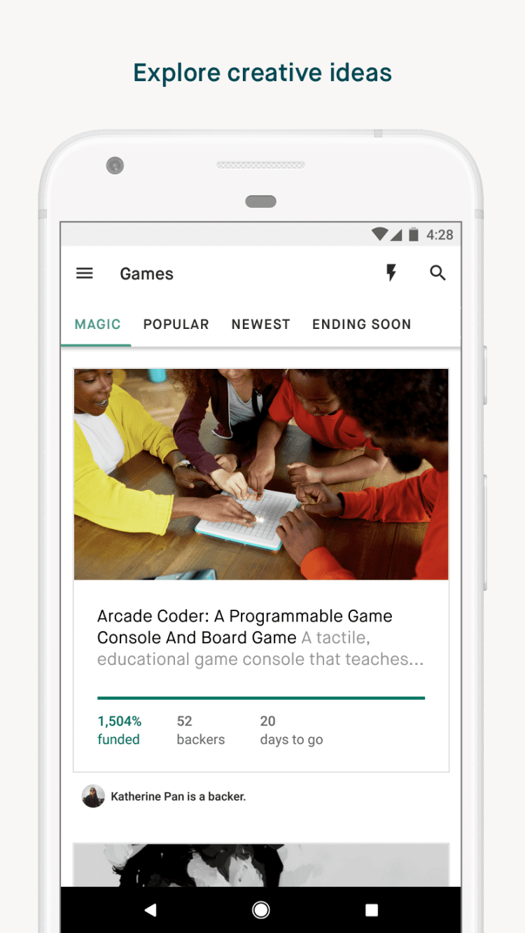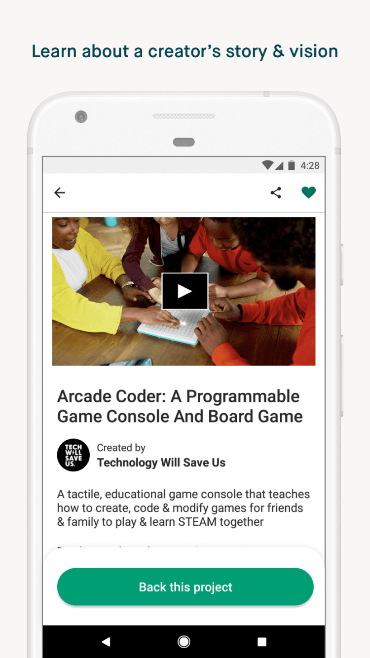 Скачайте приложение Kickstarter для Android и просматривайте тысячи интересных проектов со всего мира, которые могут воплотиться в реальность благодаря вам.