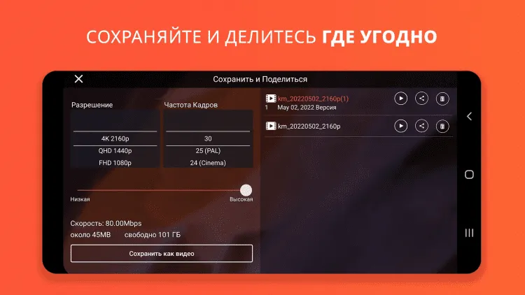 KineMaster Video Editor - приложение для видеомонтажа на мобильных устройствах Android. Объединяйте или разделяйте видео, добавляйте изображения или музыкальные дорожки из памяти своего устройства, либо используйте встроенные темы, анимацию, визуальные или звуковые эффекты, а так же многое другое. Создавайте высококачественные Full HD видео в формате mp4 или MPEG-4, перекодируйте их из 1080p в 720p, если ваше устройство не поддерживает 1080p, а так же делитесь полученными видео с друзьями через социальные сети.