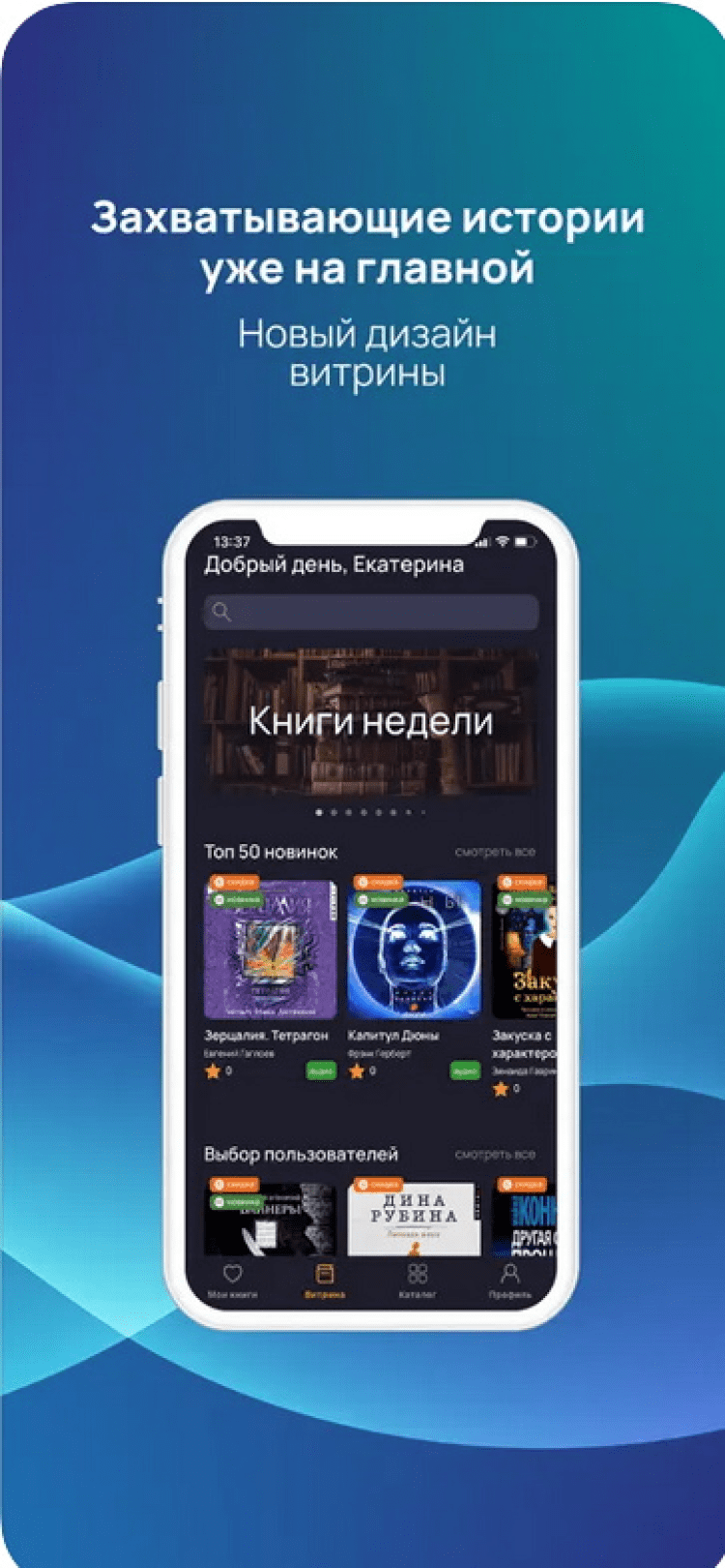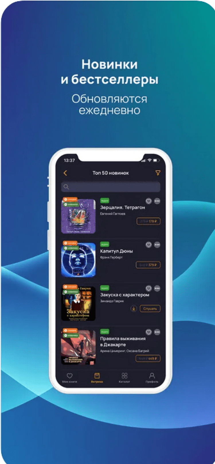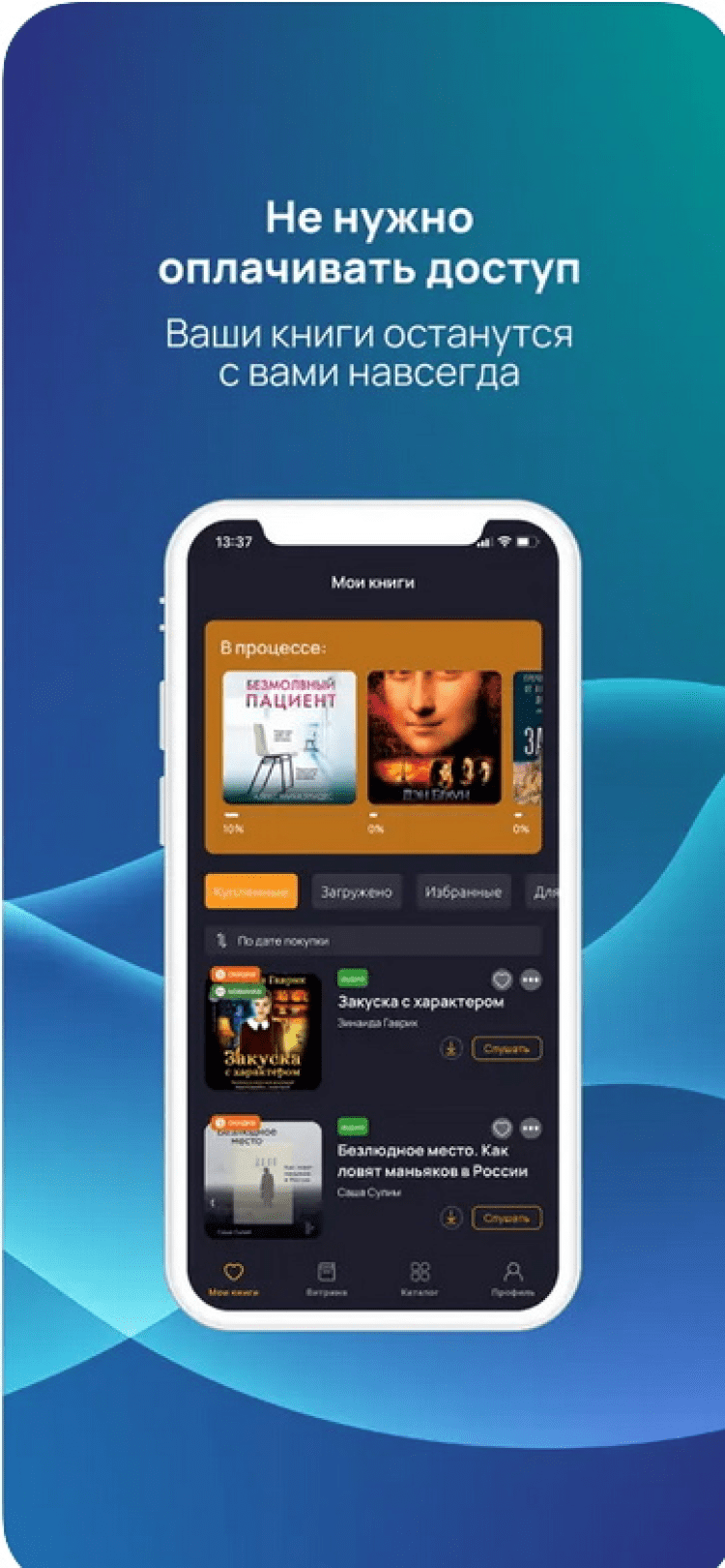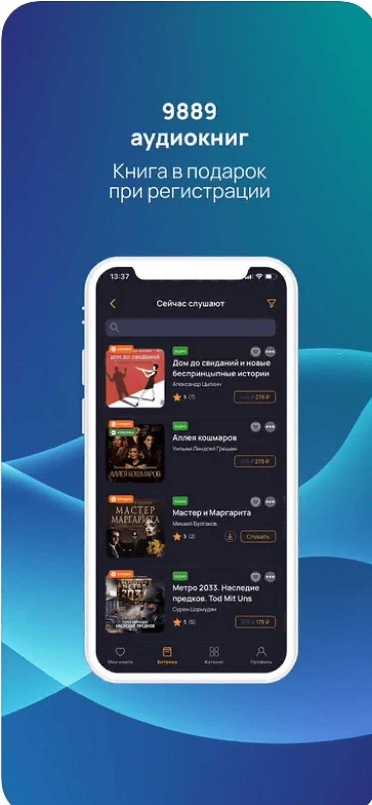 Установив приложение Книга вслух для iOS, вы получите 37 книг бесплатно. Кроме того программа обладает большой, регулярно обновляющейся библиотекой, удобными подборками по автору и жанрам, а также удобным поиском. При этом, ежедневно пополняется не только количество книг в библиотеке, но и появляются новые скидки, своевременно узнавать о которых поможет функция уведомлений.