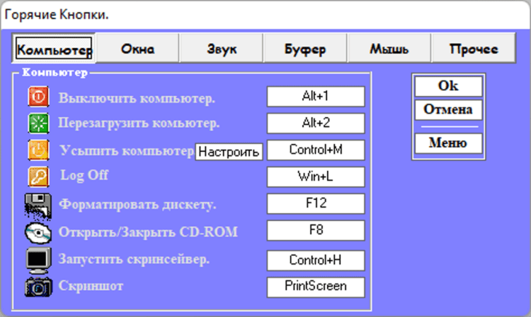 Кнопы Программа экономит Ваше время и нервы, не надо запоминать, где лежат любимые проги, переползать туда через проводник, с Кнопами достаточно один раз выбрать программу, задать комбинацию клавиш для запуска и всё. Добавлено: смотрите на домашней странице Не нагруженный, привлекательный интерфейс позволит легко разобраться и быстро настроить Кнопы под Ваши нужды. Функции: Включение, перезагрузка компьютера, форматирование дискет, открытие / закытие CD-ROM, пряталка 5 окон, запуск ScreenSaver`а, закрытие окна(чтоб не тянуться к крестику), окно OnTop, регулятор громкости, календарь.