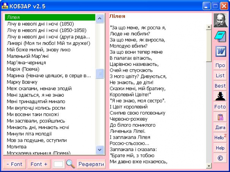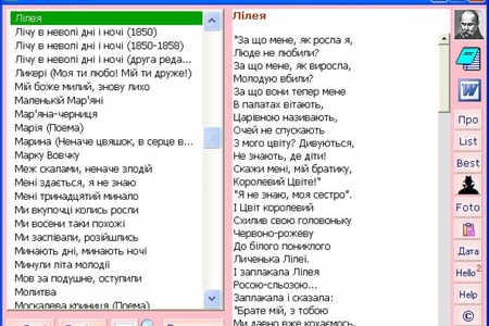 Кобзар - это полный сборник стихотворений Т.Г. Шевченко в компьютерной программе на укр. языке. Программа включает в себя полный сборник стихотворений, биографию, известные портреты, несколько художественных работ, 11 рефератов о жизни и творчестве поэта и художника Т.Г. Шевченко.