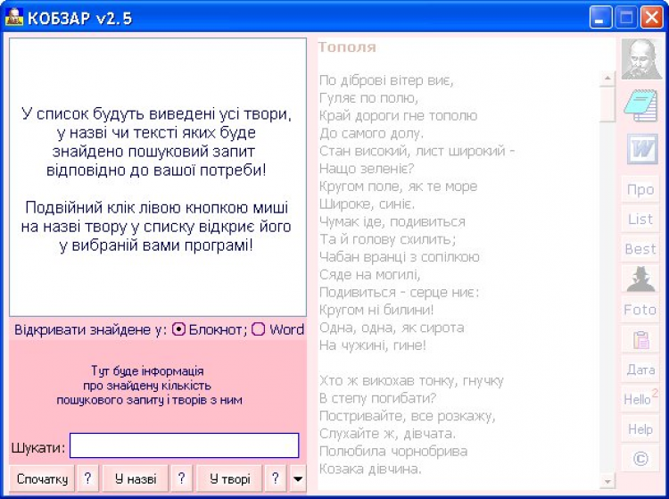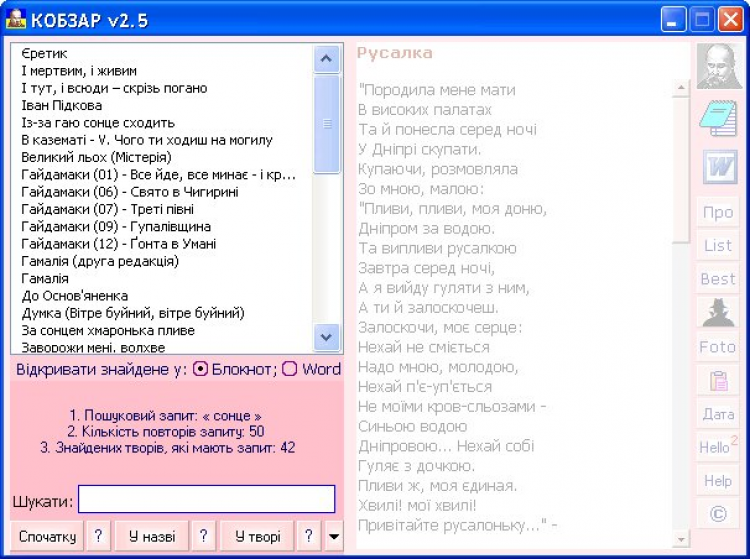 Функции программы позволяют: быстро найти, просмотреть, и открыть выбранный материал в программе "Блокнот" или "Word", провести быстрый поиск и подсчет количества поискового запроса во всех произведениях сразу, и в определенном произведение, с быстрым перемещением по тексту произведения местоположениями поискового запроса с функцией его визуального выделения.