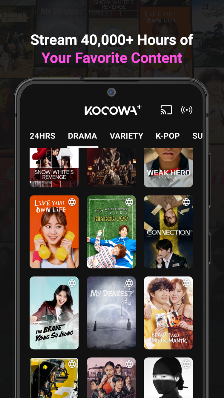 Погрузитесь в яркий мир корейских развлечений с приложением KOCOWA+. От последних новинок мира корейского кино до многочисленных эксклюзивных шоу — платформа предлагает богатый выбор видео, которые будут развлекать вас тысячи и тысячи часов. Последняя версия приложения предлагает богатый выбор высококачественного контента, который удовлетворит все ваши предпочтения. Здесь вы можете наслаждаться как потоковой передачей в высоком разрешении, так и функцией скачивания видео для просмотра в автономном режиме, все в удобном для навигации интерфейсе.