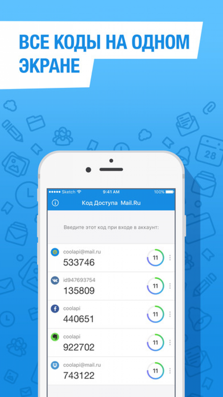 Скачайте также приложение Код Доступа Mail.Ru для Android.
