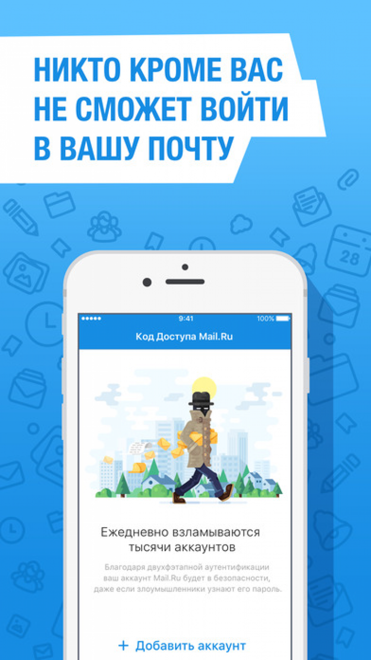 Приложение Код Доступа создет одноразовые коды, необходимые для входа в почту от Mail.ru или другие совместимые сервисы. После ввода логина и пароля, вам необходимо будет подтвердить свою личность, путем ввода сгенерированного программой пароля. Узнать эти коды без вашего мобильного устройства невозможно. Это поможет снизить до минимума риск кражи аккаунта.