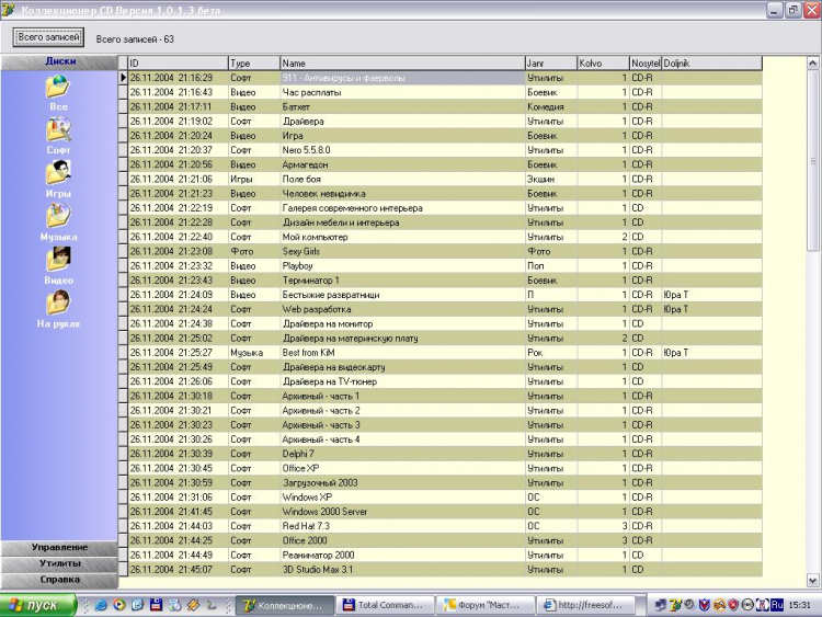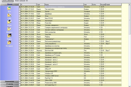 Коллекционер CD - это программа для ведения баззы данных ваших компакт дисков. К программе прилагается демонстрационная база данных (БД моих дисков) Она нужна лишь для демонстрации возможностей и интерефейса программы. Войдя на закладку Управление вы можете удалить мои диски и начать вести свою базу. Для работы программы необходим BDE!