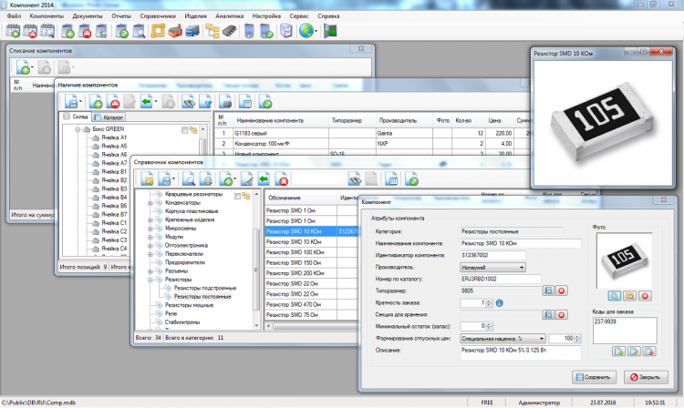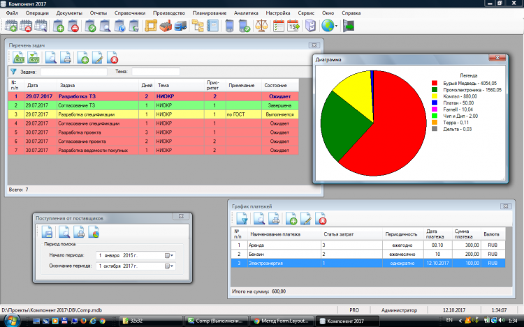 Компонент 2017 - это программа реализует контроль полного жизненного цикла изделий, включая разработку, производство и сбыт продукции: создание электронной структуры изделий, спецификаций и перечней элементов, оформление заказов покупателей, выставление счетов на оплату, поиск наличия комплектующих компонентов на складе, формирование ведомостей на закупку компонентов, создание заказов поставщикам комплектующих, оприходование поступивших компонентов, списание компонентов в производство, учет полуфабрикатов, учет отгрузки готовой продукции.