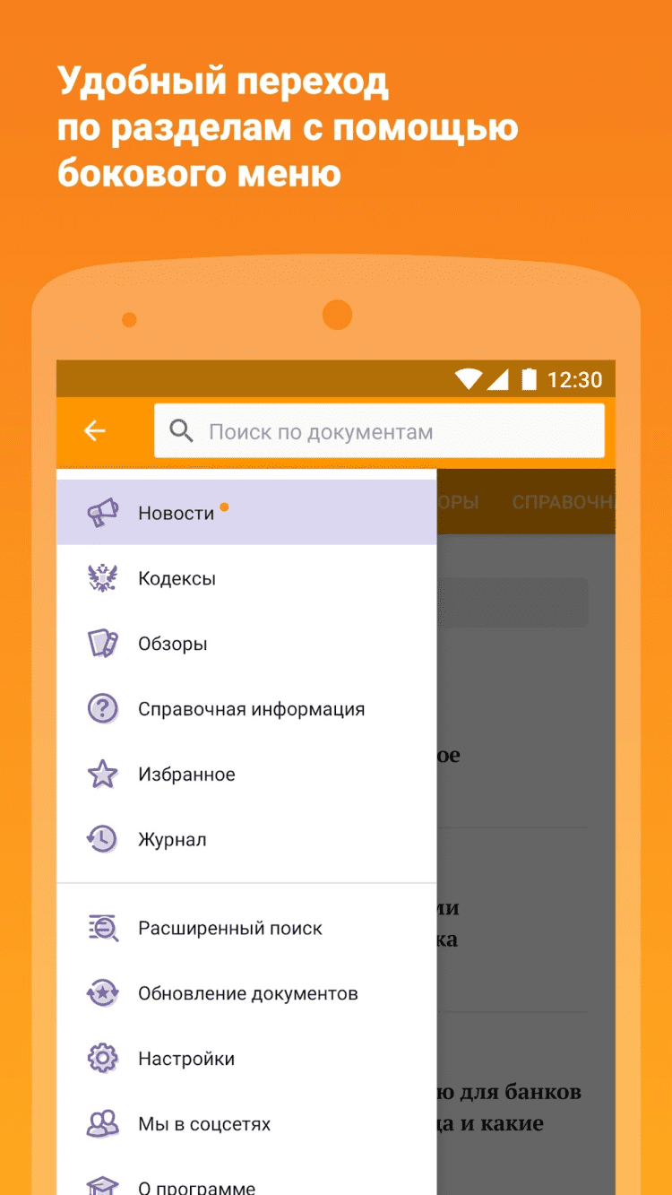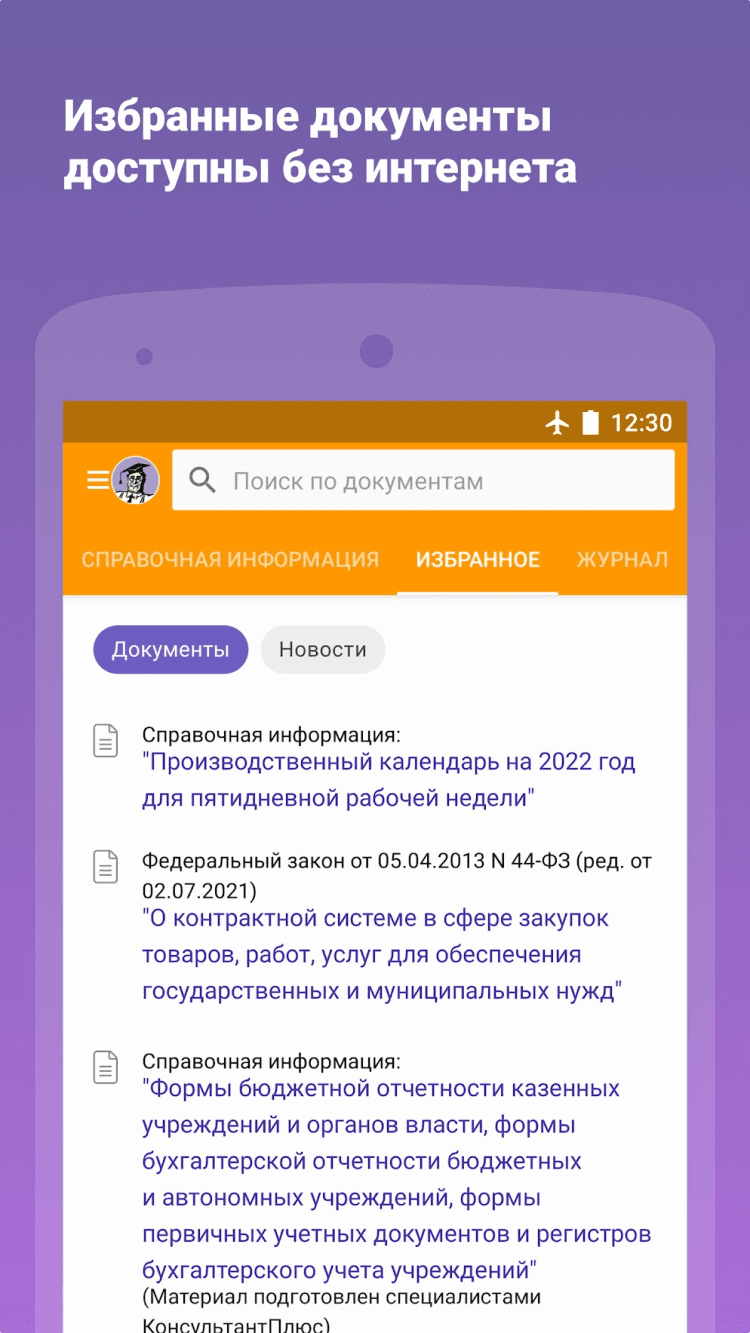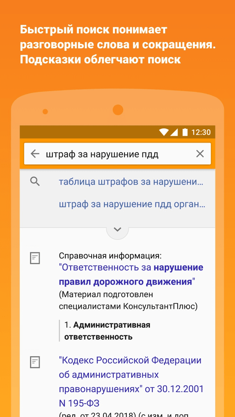 КонсультантПлюс Это приложение позволит вам в любой момент получить доступ к наиболее востребованной правовой информации в любой момент: к кодексам РФ, основным правовым актам федерального законодательства, к обзорам новых документов и справочным материалам. Так же, это приложение позволит вам получить сведения по вопросам защиты прав потребителей, налоговых льгот и вычетов, защиты трудовых прав, оформления и защиты имущественных прав, штрафов за административные правонарушения и нарушение ПДД, получения материнского капитала, оплаты налогов физическими лицами, и многим другим. Для доступа к данным в режиме оффлайн, необходимо добавить нужный документ в избранное. Информация в приложении регулярно обновляется.