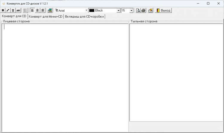 Конвертик для CD-дисков - это программка, которая поможет Вам разметить на листе А4 контуры для будущего конвертика для CD и мини-CD дисков. При этом можно сразу разместить на лицевой и тыльной сторонах шаблона всю необходимую информацию, в том числе и рисунок (только для лицевой стороны). Для чего на панели инструментов расположены все необходимые инструменты редактирования текста.