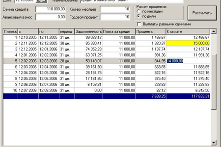 Исходные данные для расчетов: сумма кредита, годовой %, срок кредита в месяцах, первоначальный взнос. Результатом работы программы является расчет погашаемой части кредита, начисляемых %% от суммы задолженности, общей суммы месячной выплаты, суммы долга после внесения платежа. Можно вносить фактически выплаченные суммы по каждому месяцу. При этом программа пересчитает оставшиеся выплаты с учетом начисленных %%. В итоговой строке подсчитывается сумма выплаченных %% и сумма кредита с учетом начисленных %%.