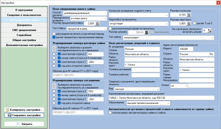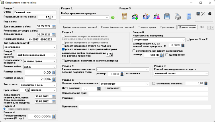 - печать документов - договора займа, графика платежей, квитанции об оплате и любого произвольного документа;