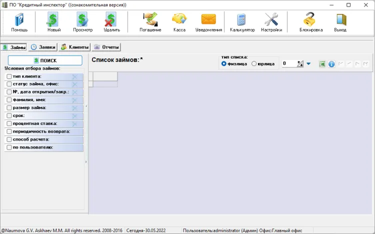 Кредитный инспектор - это программа для автоматизации учета выдачи займов (кредитов, ссуд), товарных кредитов, идеально подходит для краткосрочных займов, микрокредитования.