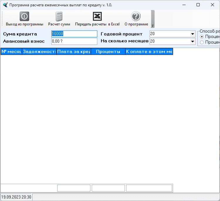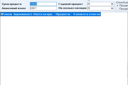 Кредитный калькулятор - это бесплатная программа, которая ппозволит Вам рассчитать суммы ежемесячных взносов и процентов по кредиту. Полученный результат, можно экспортировать в Excel. Проста в использовании.