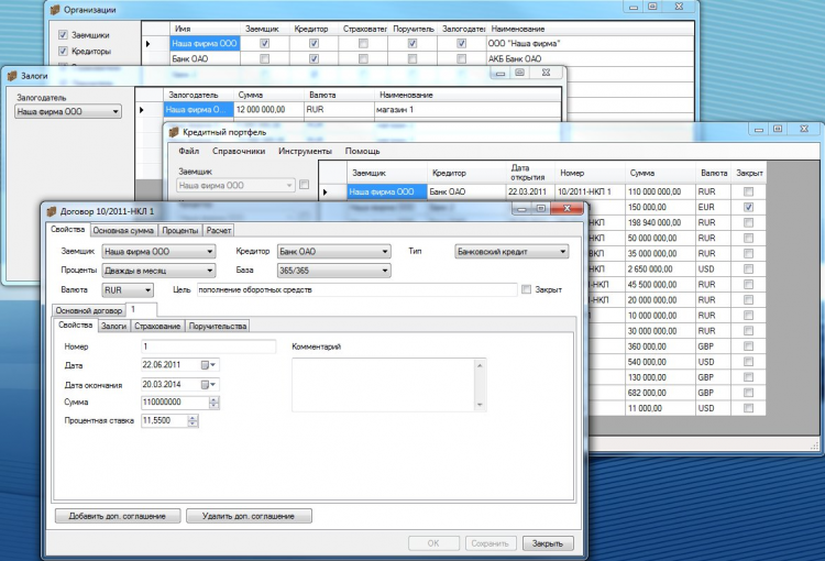 Программа позволяет веcти учет по кредитным портфелям нескольких юридических лиц и формировать отчетные формы в файлах формата Excel.
