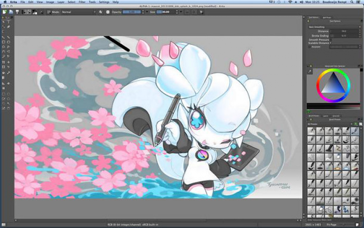 Krita предлагает поддержку CMYK и HDR-рисование, инструменты для работы с перспективой, настраиваемые панели, встроенный помощник, и внушительный набор кистей. Последние обладают гибкими настройками, изменяя которые можно добиться желаемого эффекта.