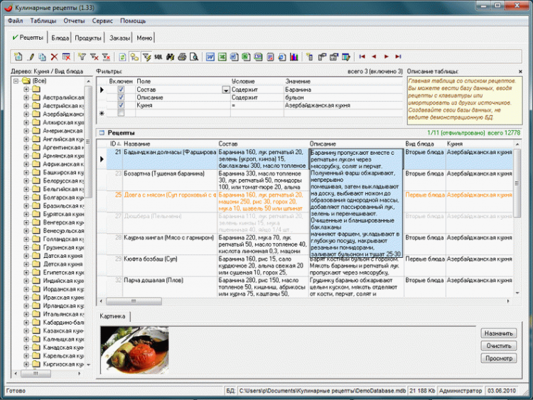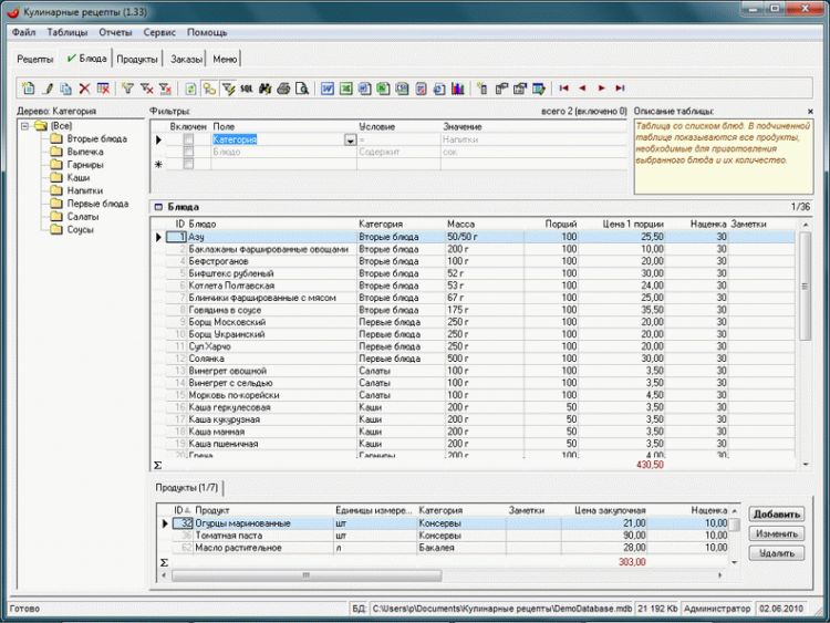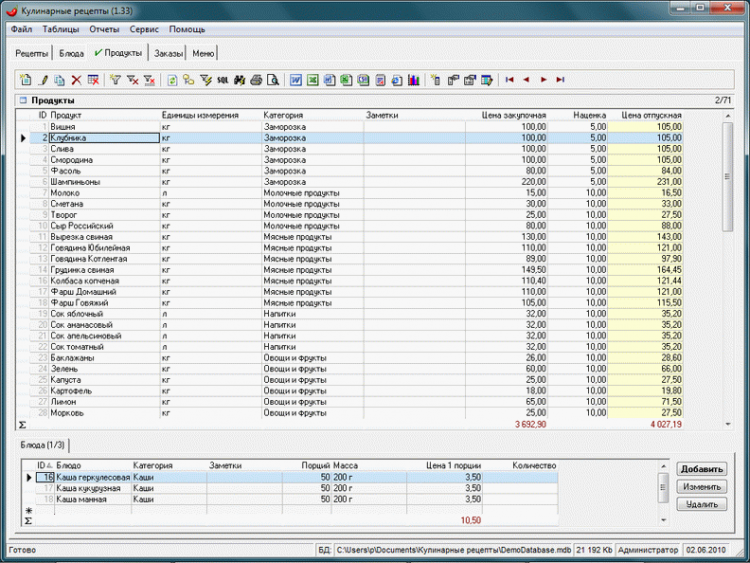 Кулинарные рецепты - это программа предназначена для ведения базы данных кулинарных рецептов, учета продуктов, составления и калькуляции блюд, расчета цен и других целей. Программа содержит более 12000 готовых рецептов и описания приготовления блюд из любых продуктов. Вы можете автоматизировать процесс составления калькуляционных карт, меню, блюд и движения продуктов на складе.