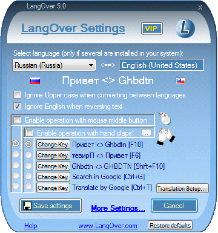 LangOver позволяет искать выделенное слово или словосочетание в Google (Ctrl+G) и переводить текст на другой язык (Ctrl+T). Последная функция использует онлайновый переводчик Google Translate, поэтому необходимо подключение к Интернету.
